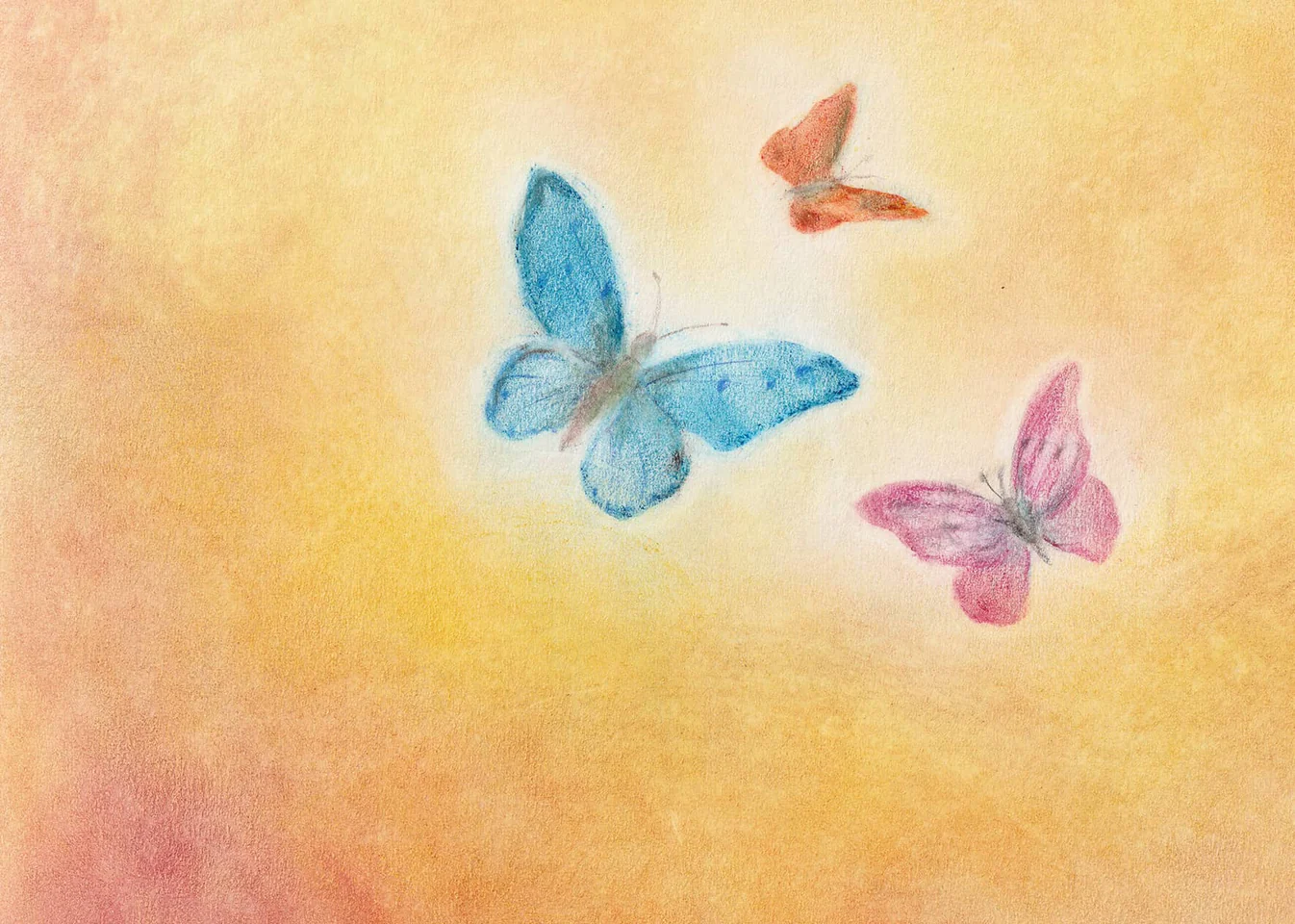Three butterflies flutter in a sunny sky. This cheerful motif is by the artist Andrea Reiß and was created using the Seccorell finger-wiping technique. The card is perfect for spring and summer greetings or as a light and friendly message.