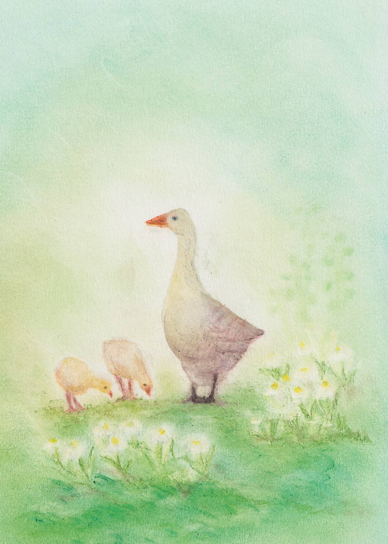 The depiction of the little goose family amidst flowers is by Andrea Reiß. Created using the Seccorell finger-wipe painting technique, this card is well-suited for spring greetings, birth announcements, or simply as a loving message.