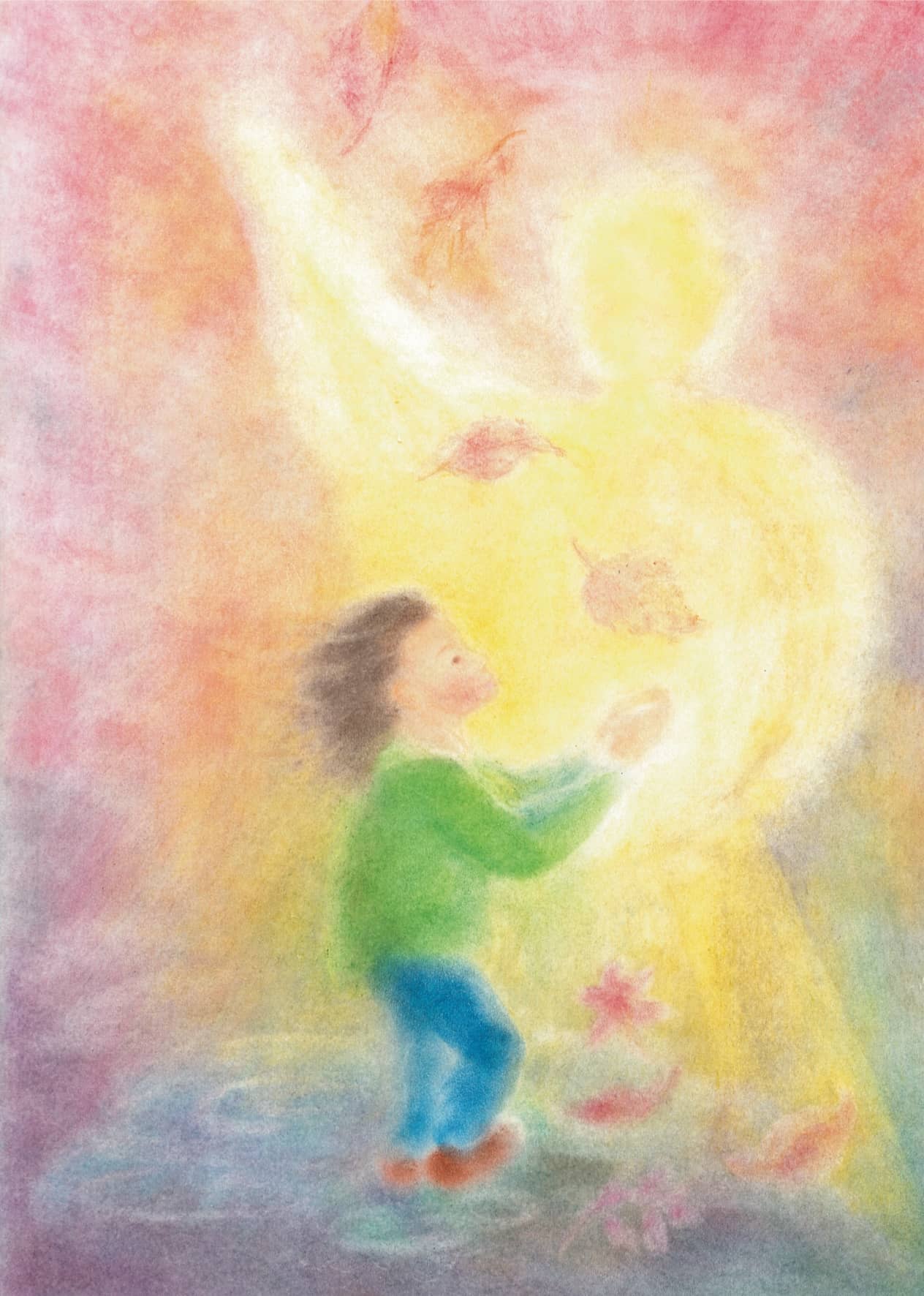 The “Guardian Angel” postcard by Andrea Reiß shows a protective angelic being gently watching over a child. The soft transitions and radiant colors were created using the Seccorell finger-wipe painting technique.