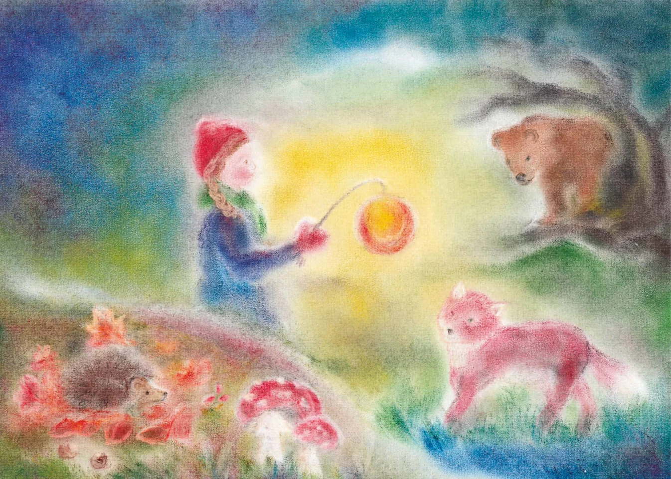 The postcard “Lantern child with animals” by Andrea Reiß shows a child with a lantern, surrounded by forest animals such as a fox, bear and hedgehog looking at the soft lantern light. The motif was created using the Seccorell finger-wipe painting technique.